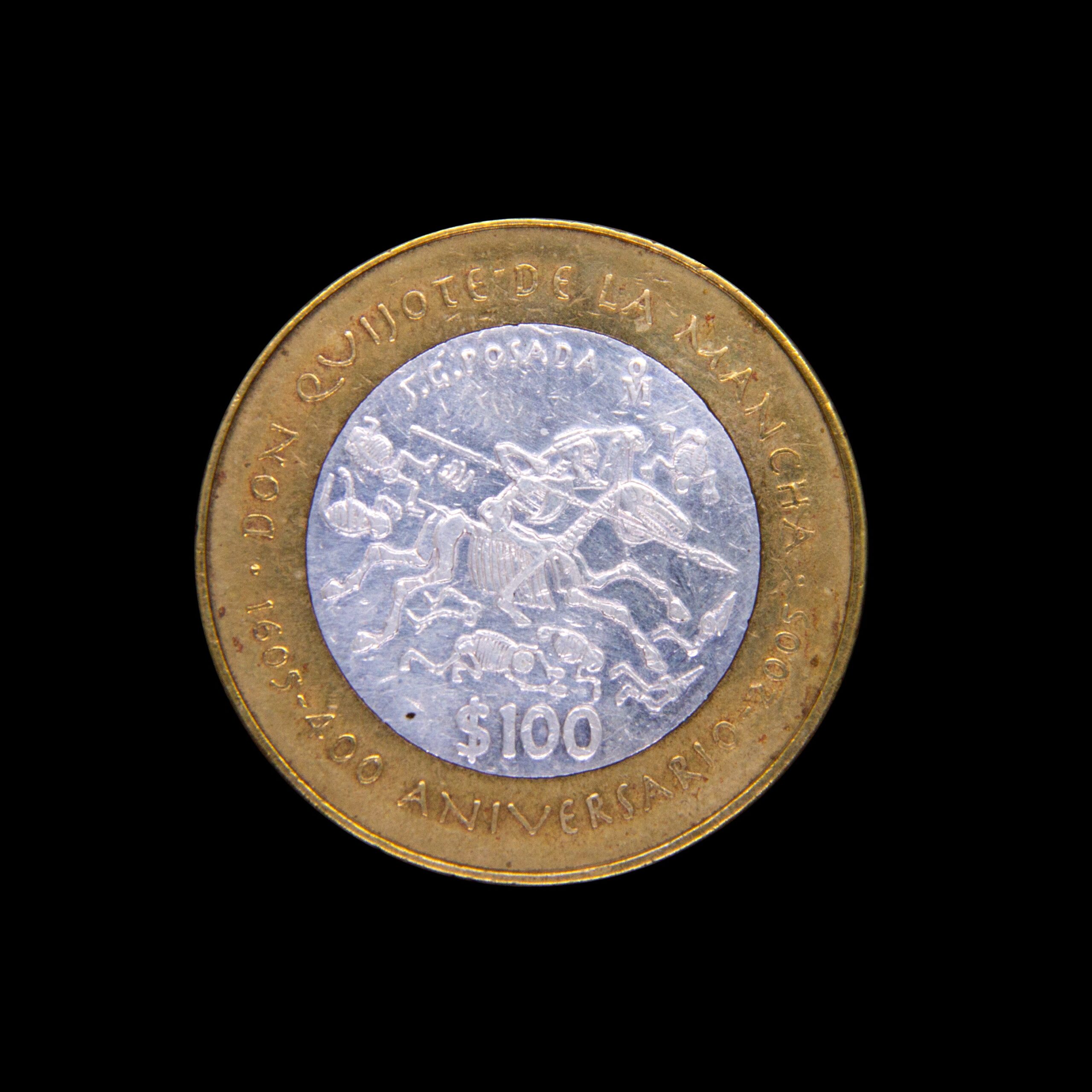 Moneda de $100°° alusiva al 400 Aniversario de “El Ingenioso Hidalgo, Don Quijote de la Mancha”; centro de plata ley 0.925, en muy buena condición.Precio $949°° Comprar