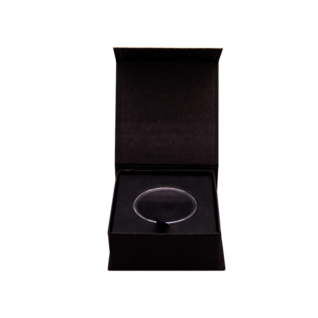 Exhibidor tipo joyero con cápsula de 46mm y arillo de foami ajustable.$89°°